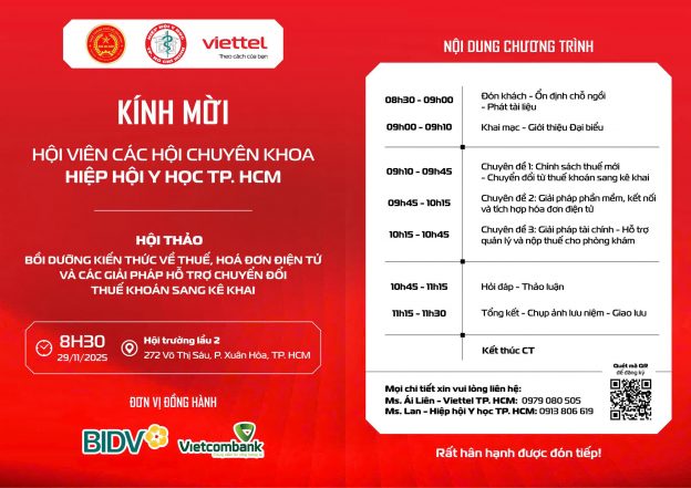 THƯ MỜI THAM DỰ HỘI THẢO Bồi dưỡng kiến thức Thuế – Hóa đơn điện tử – Giải pháp hỗ trợ chuyển đổi từ Thuế khoán sang Thuế kê khaiKính mời Quý Hội viên tham dự Hội thảo chuyên đề đặc biệt do Hiệp Hội Y Học TP.Hồ Chí Minh – Thuế TP.HCM phối hợp cùng Viettel TP.HHCM tổ chức.Buổi ...